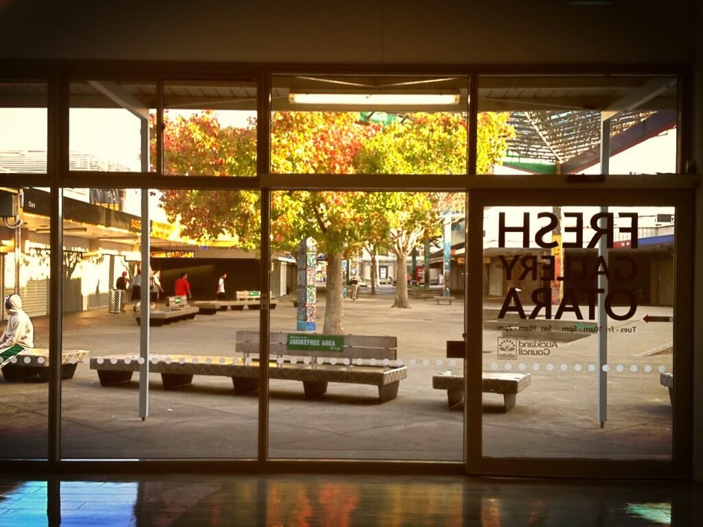 Looking out of Fresh Gallery Otara to the Otara Town Centre
