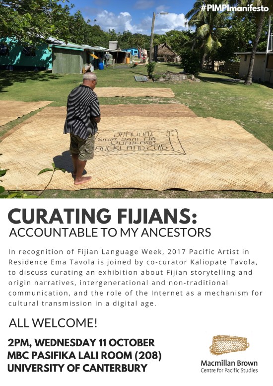 Ema Tavola is the 2017 Macmillan Brown Centre for Pacific Studies Artist in Residence. She is a South Auckland-based practicing curator of Fijian and Pākehā heritage, and currently researching and writing a manifesto exploring modes of decolonising Pacific art curating.