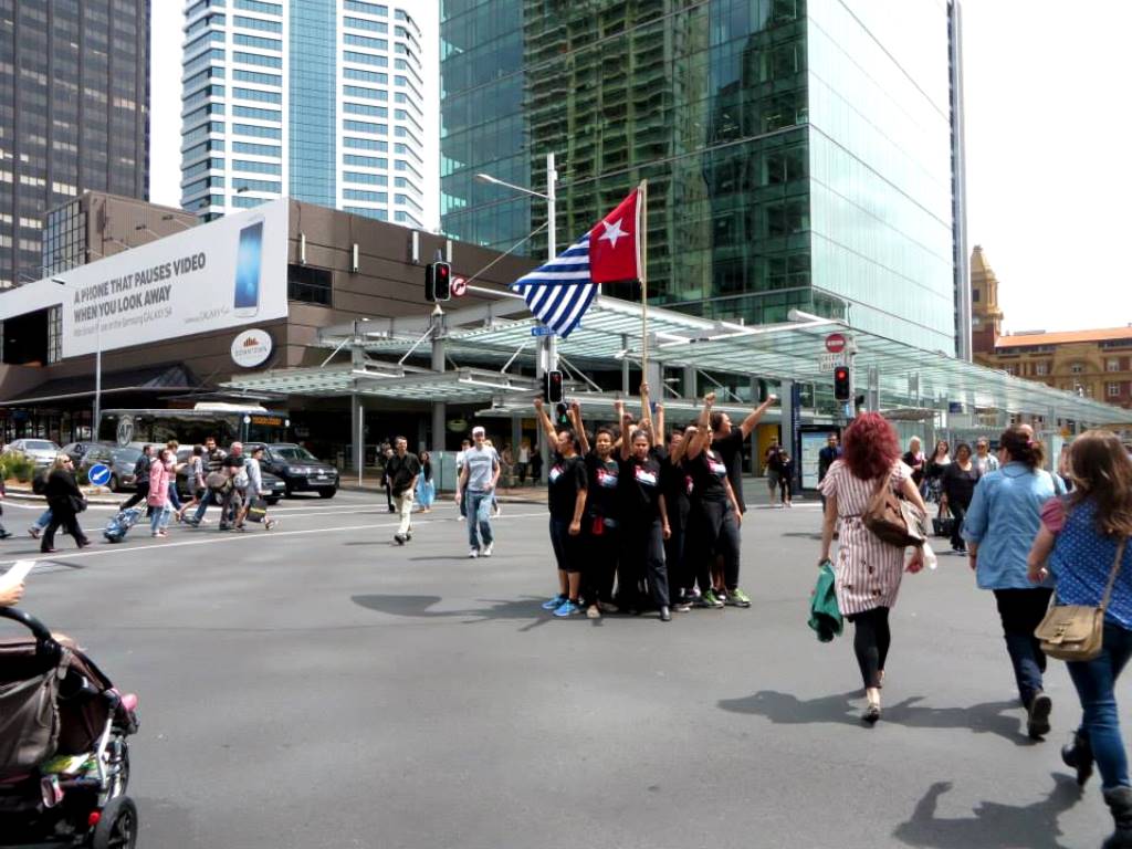 In a performance called, “Rise of the Morning Star” the West Papuan flag was raised 15 times at traffic intersections on Auckland’s Queen Street on West Papuan Independence Day, December 1st.