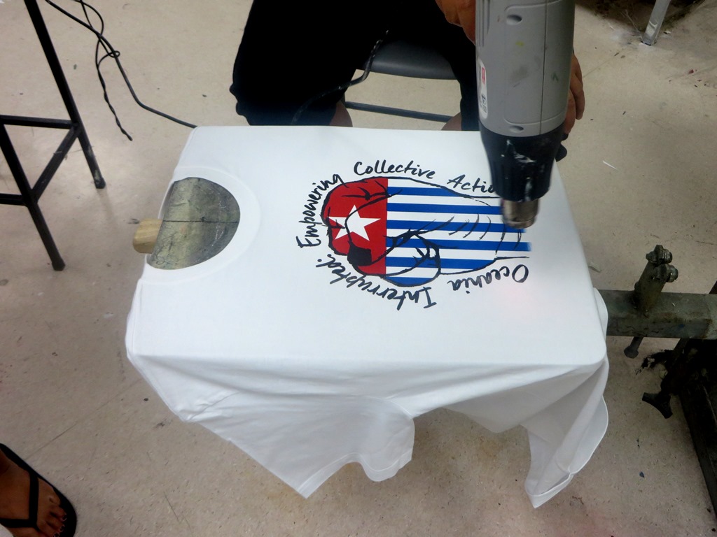 Oceania Interrupted draws women together in different capacities – there are those who put their bodies on the front line, to perform and confront; those who hand out fliers and talk to the staring public, and those who work quietly behind the scenes. A project to make an Oceania Interrupted T-shirt was undertaken by MIT Faculty of Creative Arts student, Katarina Katoa.