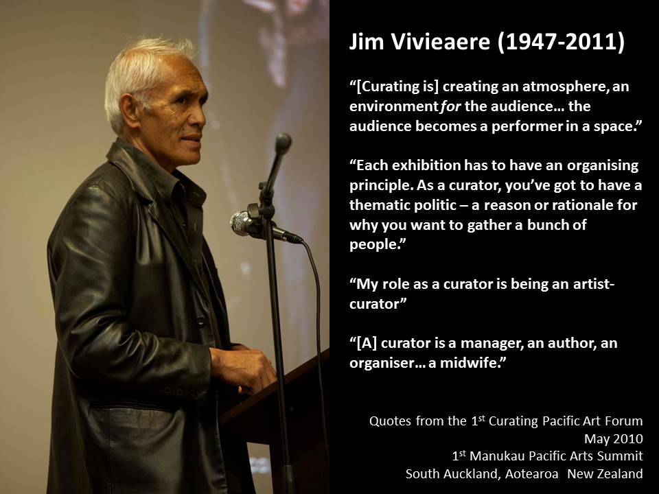 I’d like the last word to be from Jim Vivieaere, a mentor and inspiration. I had the opportunity to host a gathering in 2010 for Pacific curators and Jim spoke. He was the most eloquent, courageous Pacific arts thinker. Never pinned to an institution for long, he created wide reaching networks who all mourned his passing in 2011.